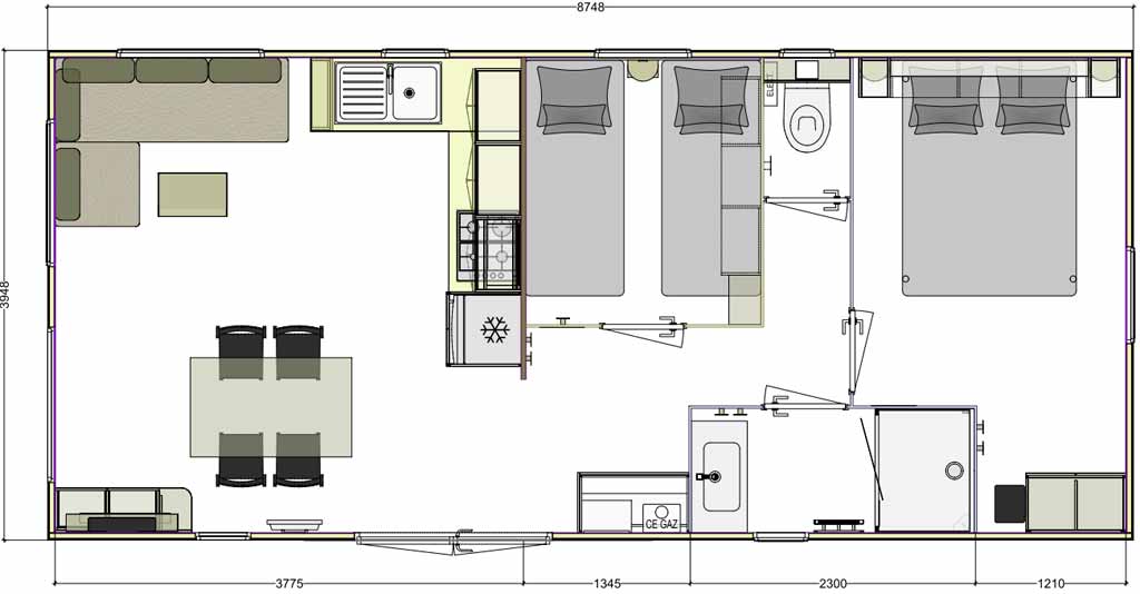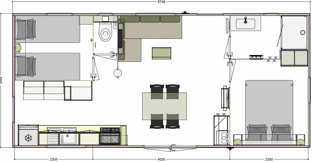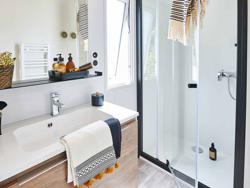 Ce mobil-home résidentiel haut de gamme est idéal pour 4 personnes, avec la possibilité d’ajouter un lit bébé dans la chambre parentale.