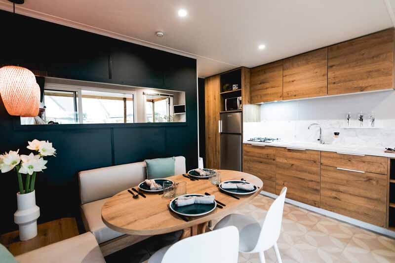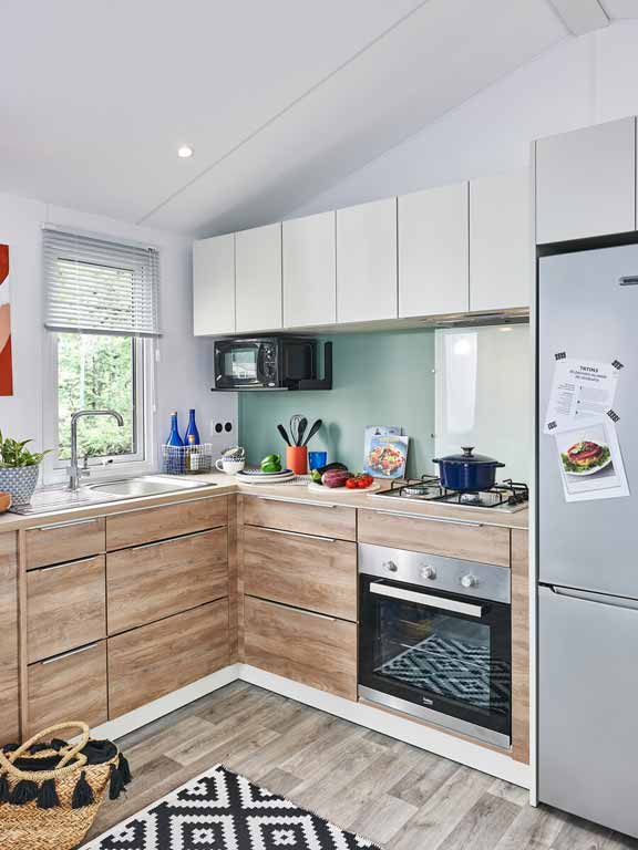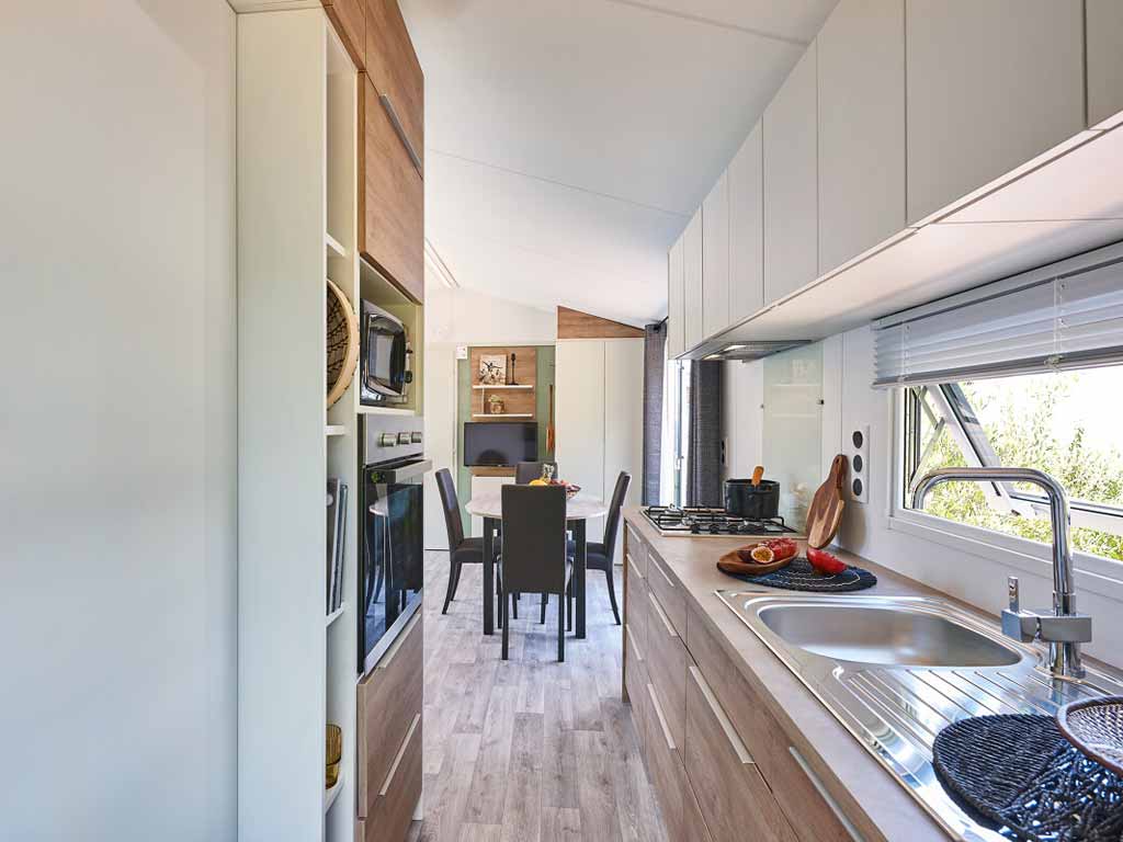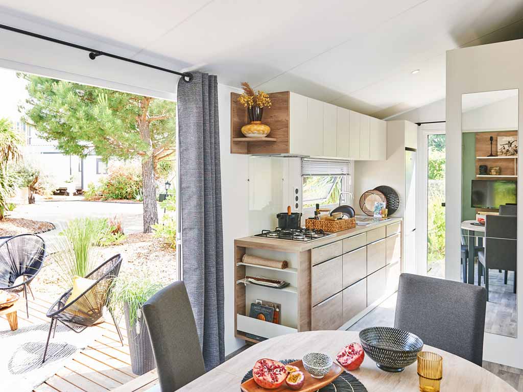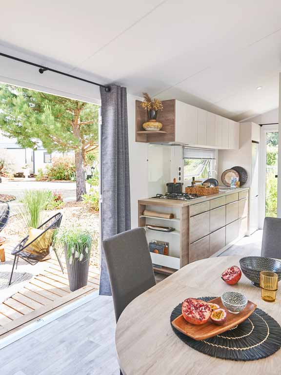 Nos mobil-homes 2 chambres disposent d'une cuisine équipée avec micro-ondes, frigo/congélateur, vaisselle, ustensiles de cuisine ...... La cuisine en enfilade est ouverte sur l'extérieur et sur le salon offrant ainsi un grand espace de vie. TV, Wifi gratuit (en cas de temps moins beau), grand terrasse plein sud avec mobilier outdoor pour vous ressourcer.